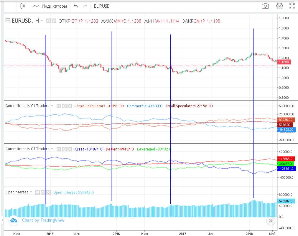 Хеджеры нас не интересуют, мелкие спекулянты — тоже, они ни на что не влияют. На что мы всегда смотрим тогда? На зеленую линию. Отчеты COT используют, в основном, для отслеживания позиций крупных спекулянтов: