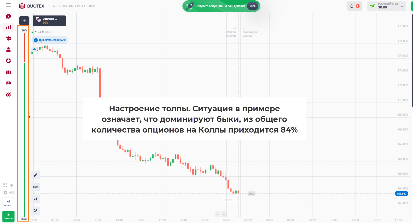 - Настроение толпы. Выглядит как вертикальная шкала в терминале, отображает распределение опционов Пут и Колл. Статистика ведется только по клиентам Quotex, особой пользы от этого инструмента нет.