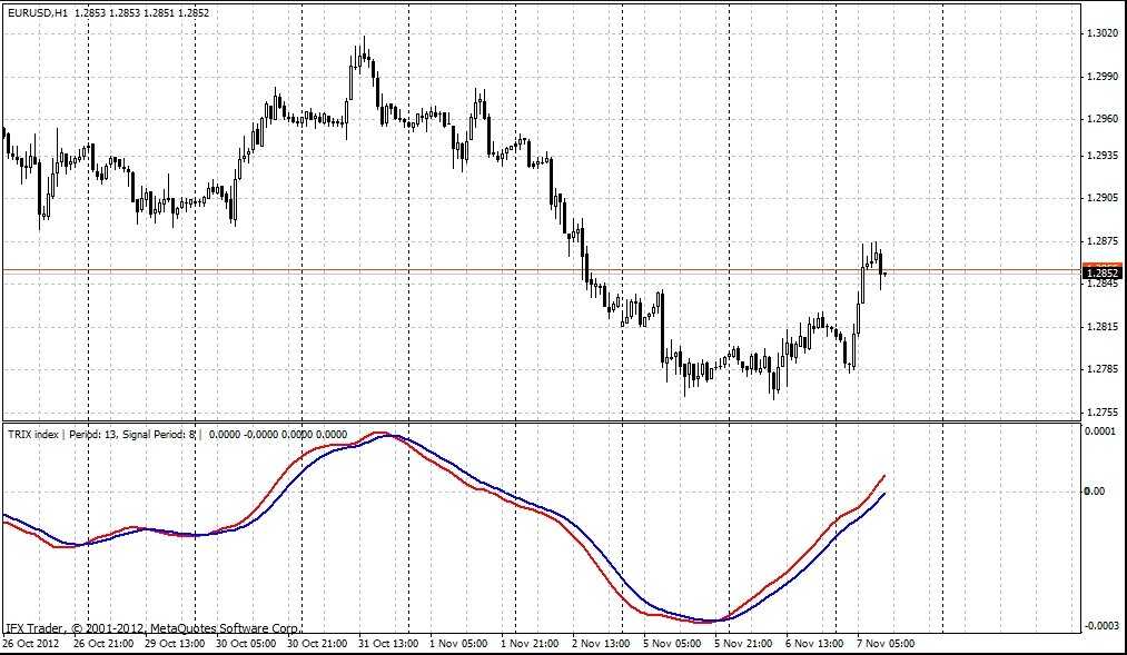 При расчётах TRIX исключает значения с меньшими периодами, чем период индикатора, тем самым сглаживает результирующую линию и исключает из неё краткосрочные колебания рынка. В результате, во время торговли позволяет не совершать лишних движений.