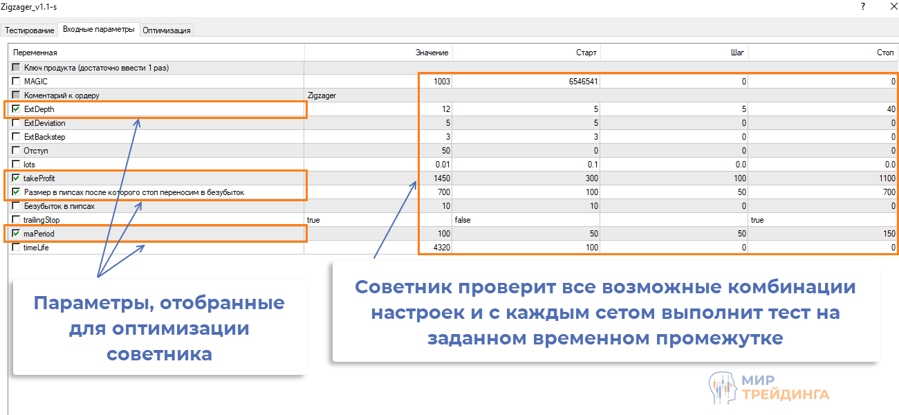 Также нужно определиться с ключевыми для оптимизации параметрами советника. Нужны только те настройки торгового робота, которые сильнее всего влияют на результат торговли. В случае с Zigzager это: