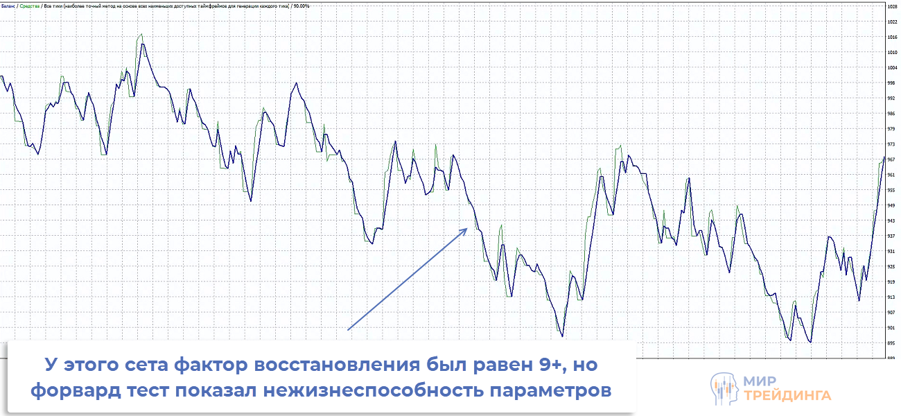 После отбора подходящего сета проводится форвард-тест, он должен быть успешным. Выше показан форвард-тест для практически идеального сета параметров после оптимизации. Очевидно, что этот набор настроек нежизнеспособен и ставить его на реальный счет нельзя.