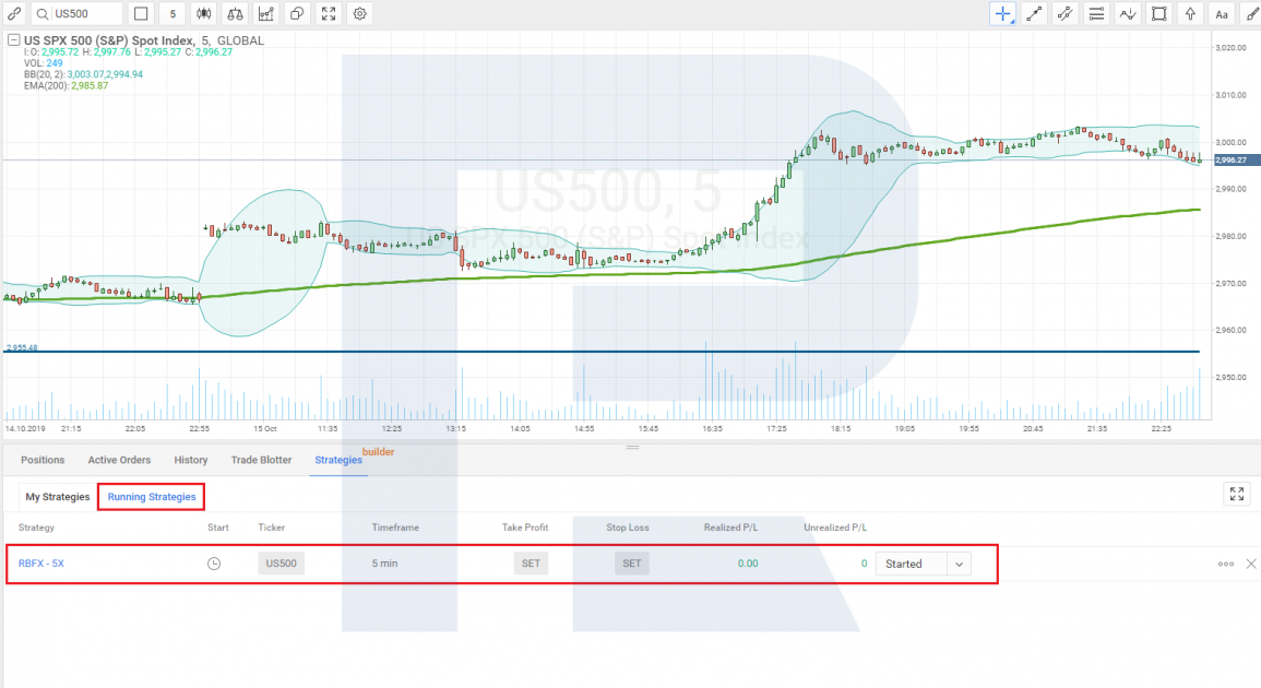 Выбор инструмента происходит автоматически. В данном случае используется тот инструмент, график которого сейчас открыт на экране, а именно US500. Дополнительно, после запуска стратегии во вкладке Running Strategies нам будет доступна информация и название стратегии, когда она была запущена, на каком инструменте, период графика и полученная прибыль.