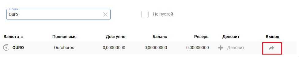 После того, как мы купим Ouro, останется лишь перевести средства на наш кошелек. Для этого нова переходим в раздел Финансы, находим монету Ouro и нажимаем на кнопку Вывод.