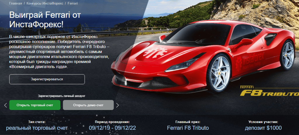 Один из наиболее эффектных конкурсов – Ferrari от InstaForex. Турнир начался 9 декабря 2019 г. и продлится до 9 декабря 2022 г. Для участия нужно лишь зарегистрировать торговый счет и пополнить его на $1000. Далее автоматически определяется так называемое Ferrari-число, каждая его цифра дает победителя по одному из 5 курсов валют.