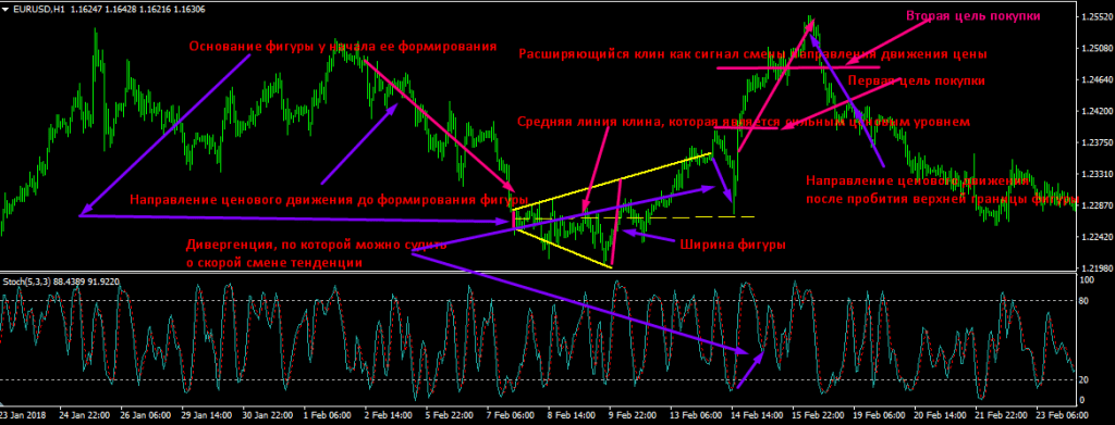 В отличии от обычной фигуры треугольника, формирование расширяющегося сопровождается повышением объемов. Это происходит потому, что количество участников рынка последовательно растет, как и напряжение на рынке.
