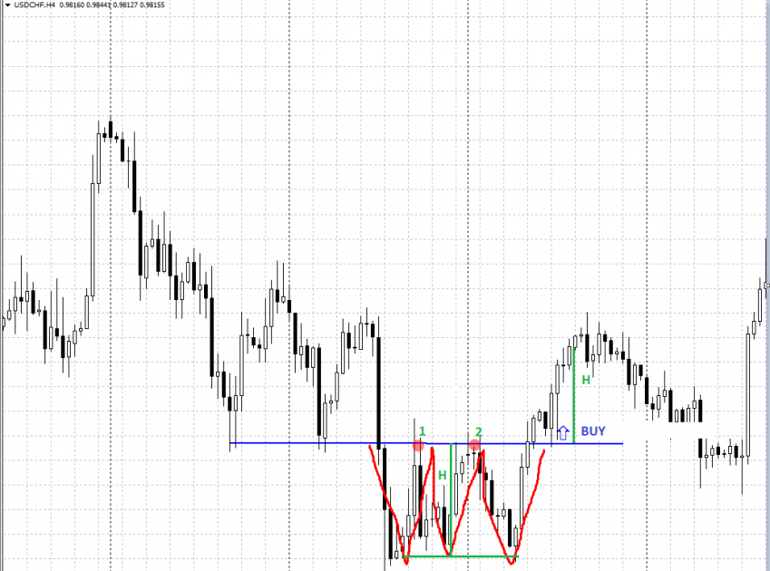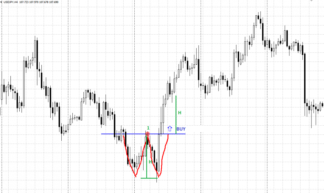 Паттерн «Двойное дно» формируется после нисходящего движения на локальном минимуме графика. Состоит из двух последовательных впадин на графике цены, через максимум между ними (точка 1) проводится горизонтальный уровень сопротивления – линия основания фигуры.