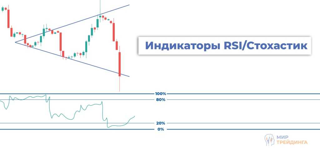 Индикаторы Стохастик или RSI. Индикаторы, которые показывают состояние актива. При достижении цены границ треугольника индикаторы будут сигнализировать о перекупленности или перепроданности актива.