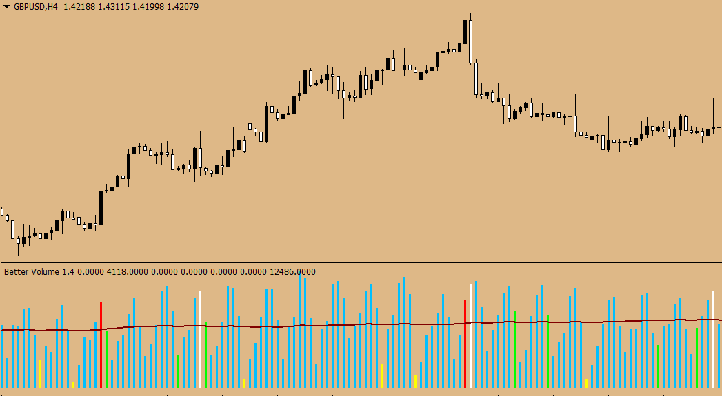 Better Volume показывает под графиком цветную гистограмму, бары которой отображают значение тиковых объемов за указанную единицу времени. Один бар соответствует одной свече графика. Цвет указывает на тип объема и направление движения цены.