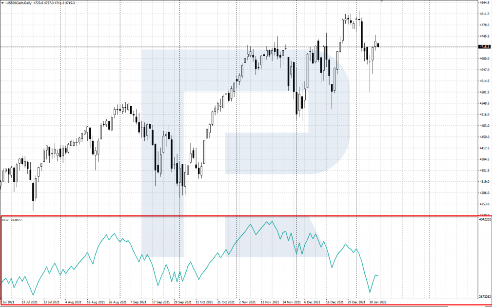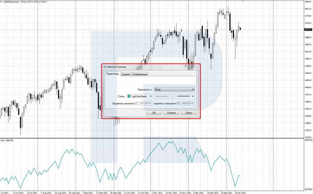 - Если цена закрытия текущей свечи ниже цены закрытия предыдущей, то величина объема за этот период вычитается из значения индикатора.