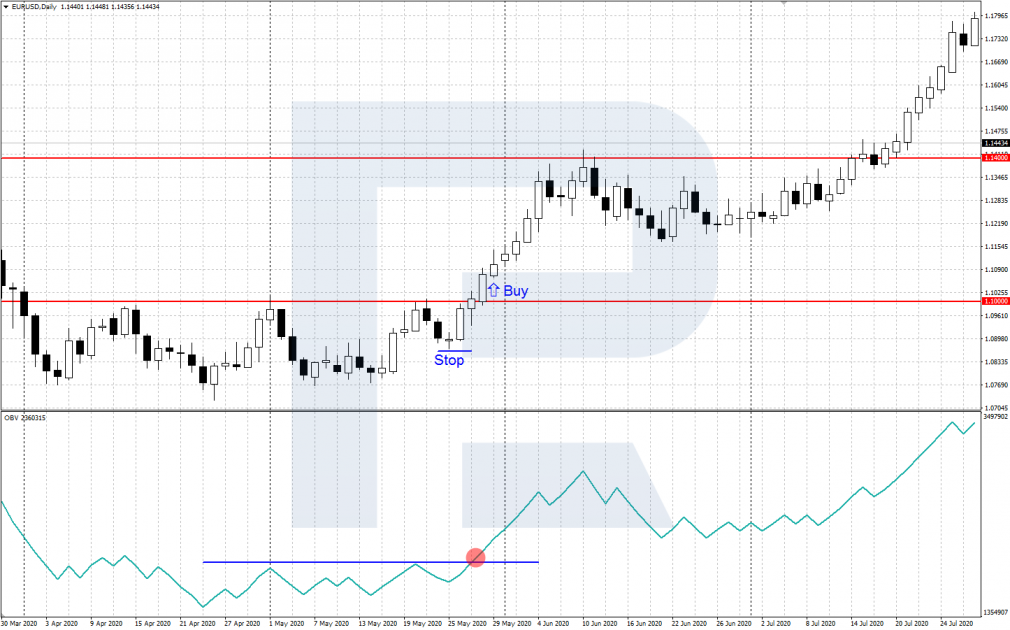 - Линия индикатора OBV подтвердила пробой, поднявшись выше своих предыдущих максимумов, — можно открывать позицию на покупку.