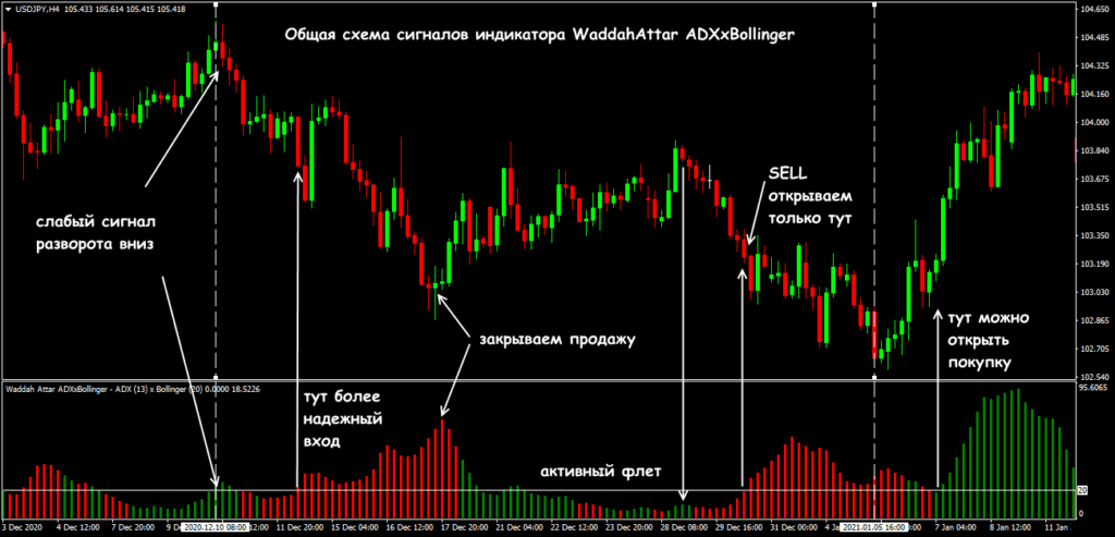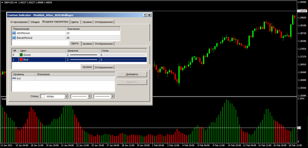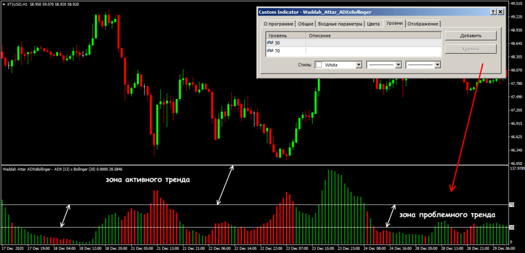 Сразу отметим, что параметры по умолчанию предполагают, что индикатор используется на торговом активе со стабильной (неспекулятивной и без гэпов) волатильностью, и на таймфрейме не ниже H1. Для мелких периодов, перед тем как с ним работать, придется менять и основные параметры. Параметр для ADX также нужно адаптировать под слишком волатильные инструменты.