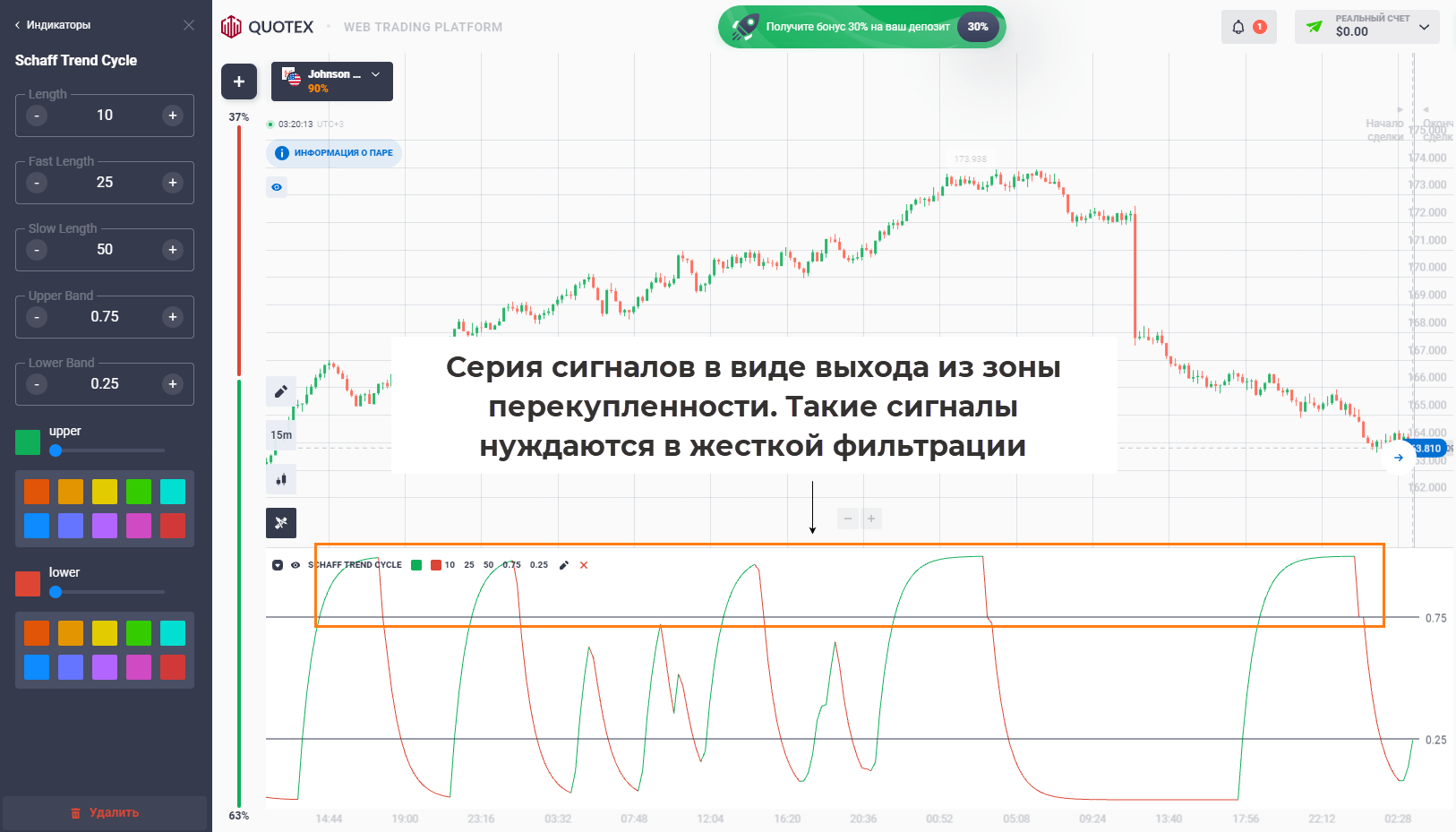 Schaff Trend Cycle. Алгоритм расчета объединяет подход MACD и Stochastic. Крайне чувствителен к малейшим движениям, в теории может давать разворотные сигналы, но они нуждаются в жесткой фильтрации.