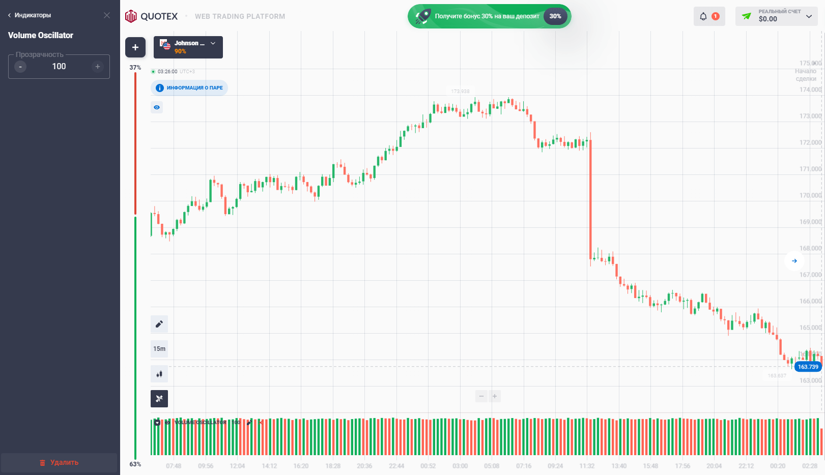 Volume Oscillator. По тиковым объемам рассчитываются 2 МА с разными периодами, затем вычисляется разница между ними. Индикатор практически бесполезен при работе с бинарными опционами.