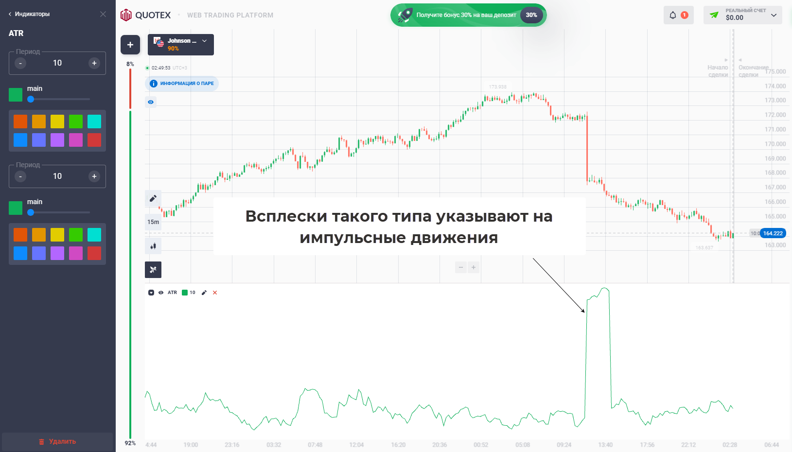 ATR. Индикатор оценивает волатильность на определенном участке рынка, если задать период, равным 1, то сможем измерять диапазон каждой свечи. ATR может использоваться для поиска импульсов.