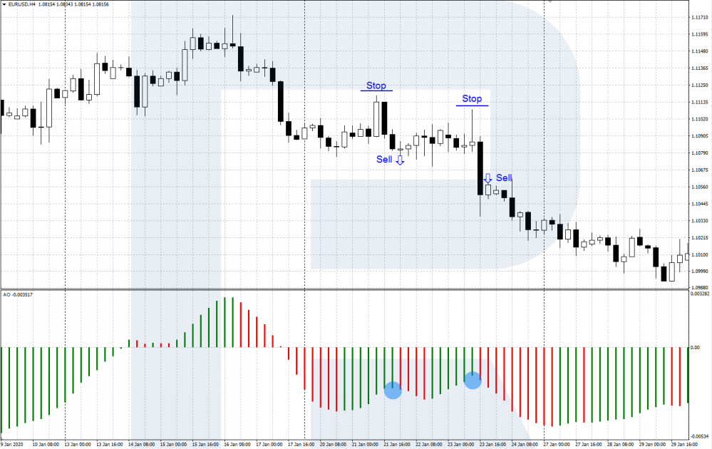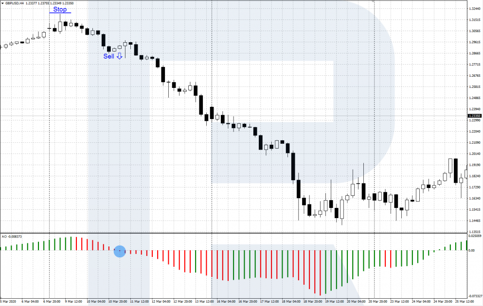 Когда гистограмма AO пересекает центральный уровень 0 сверху вниз, формируется сигнал на продажу. Идет нисходящий импульс, медведи в данный момент доминируют и лучше быть вместе с ними.