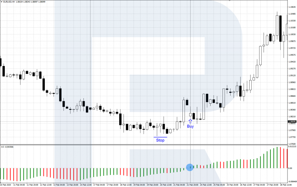 При пересечении гистограммой AO центральной линии 0 снизу вверх появляется сигнал на покупку. Идет восходящее движение, быки демонстрируют свою силу и сейчас лучше к ним присоединиться.