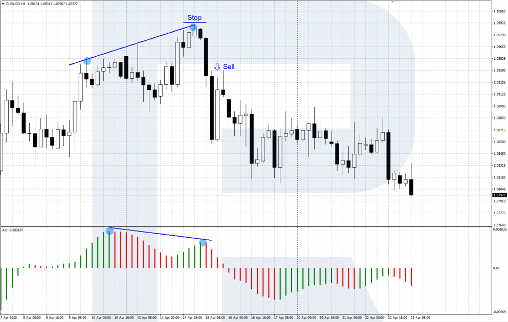 Дивергенция на продажу формируется после того, как график цены покажет очередной максимум выше предыдущего, а максимум гистограммы AO окажется ниже, чем предыдущий. Это говорит о том, что быки теряют силы и медведи постараются развернуть цену вниз. Когда цена покажет разворот вниз, можно открывать позицию на продажу, Стоп ставим за ближайшим максимумом.