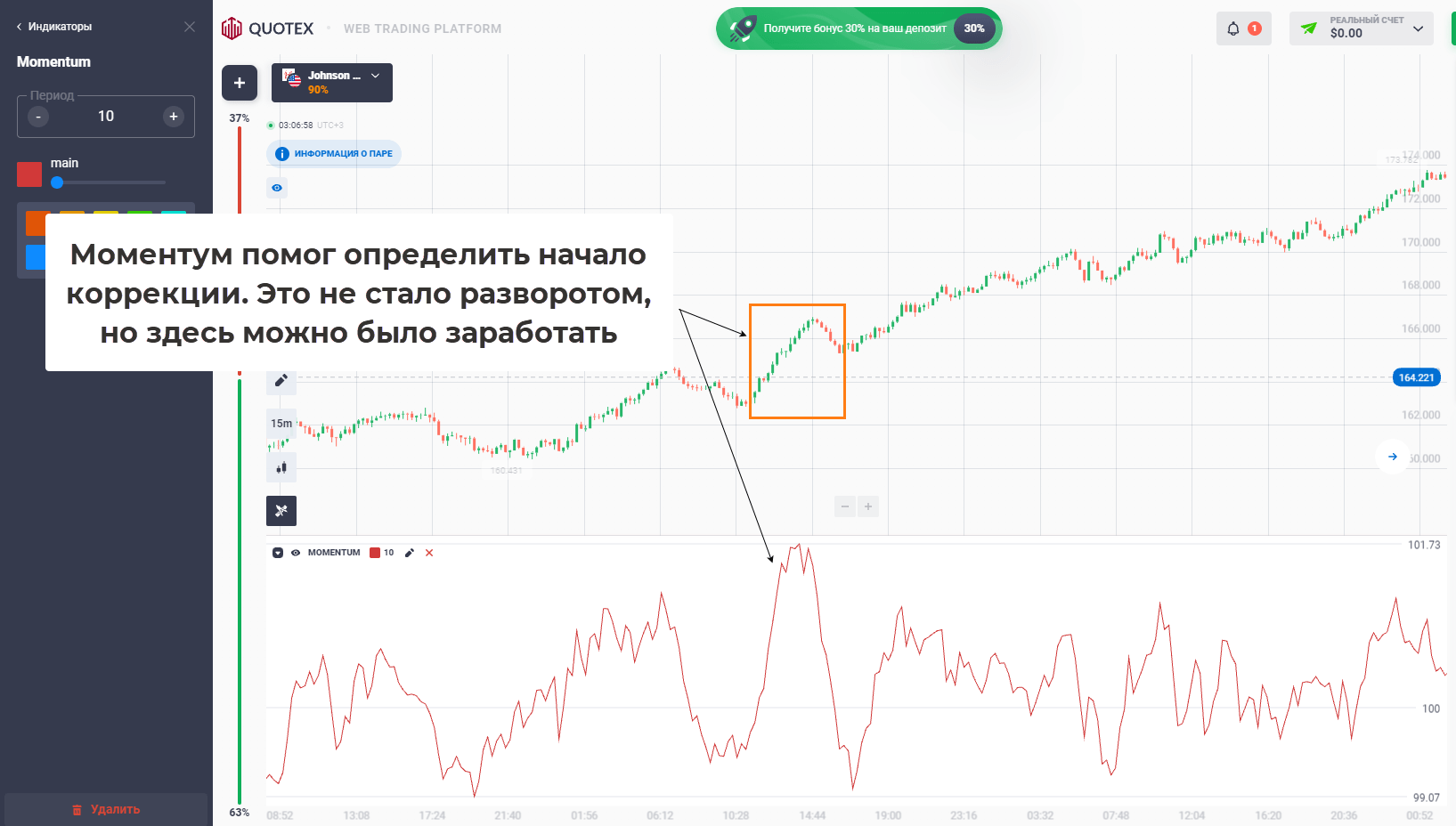 Momentum. Неплохой фильтр для подтверждения разворотных сигналов. Перед бычьим разворотом Моментум резко падает, если он резко растет, то бычий тренд скоро сменится.