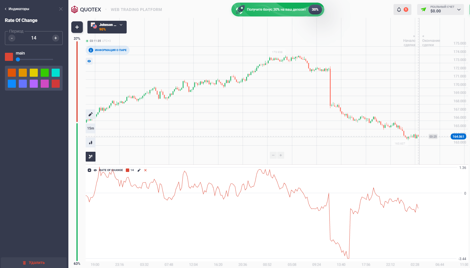 Rate of Change. RoC называют копией Моментума с незначительной корректировкой алгоритма. Ключевое отличие – уровни, у этого индикатора в роли магнита выступает нулевой уровень.