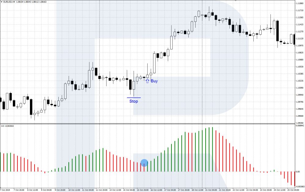 Сигнал дивергенция на покупку появляется, когда график цены формирует очередной минимум ниже предыдущего, а минимум гистограммы AO оказывается выше, чем предыдущий. Это говорит об ослаблении медведей и дает возможность быкам перейти в контратаку. После разворота графика цены вверх открывается покупка, Стоп Лосс ставится за локальный минимум.