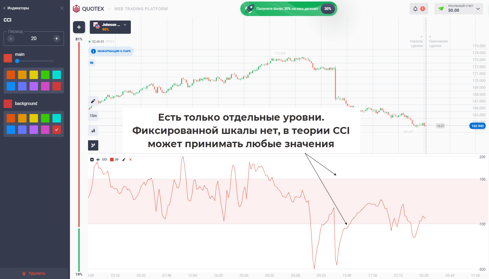 Работа индикатора строится на изучении изменения цены относительно среднего. То есть текущие показания по сути определяют степень отклонения, примерно также как это происходит и во множестве других индикаторов. Однако, как уже говорилось ранее, CCI не имеет границ, поэтому привычных по стохастику 0 и 100 мы здесь не увидим. Зато есть нулевая отметка, вокруг которой и происходит движение к разным уровням. Для полноценной работы следует добавить значения +200, +300, а также -200 и -300. Изначально их может не быть, добавлять следует в настройках – раздел “уровни”.