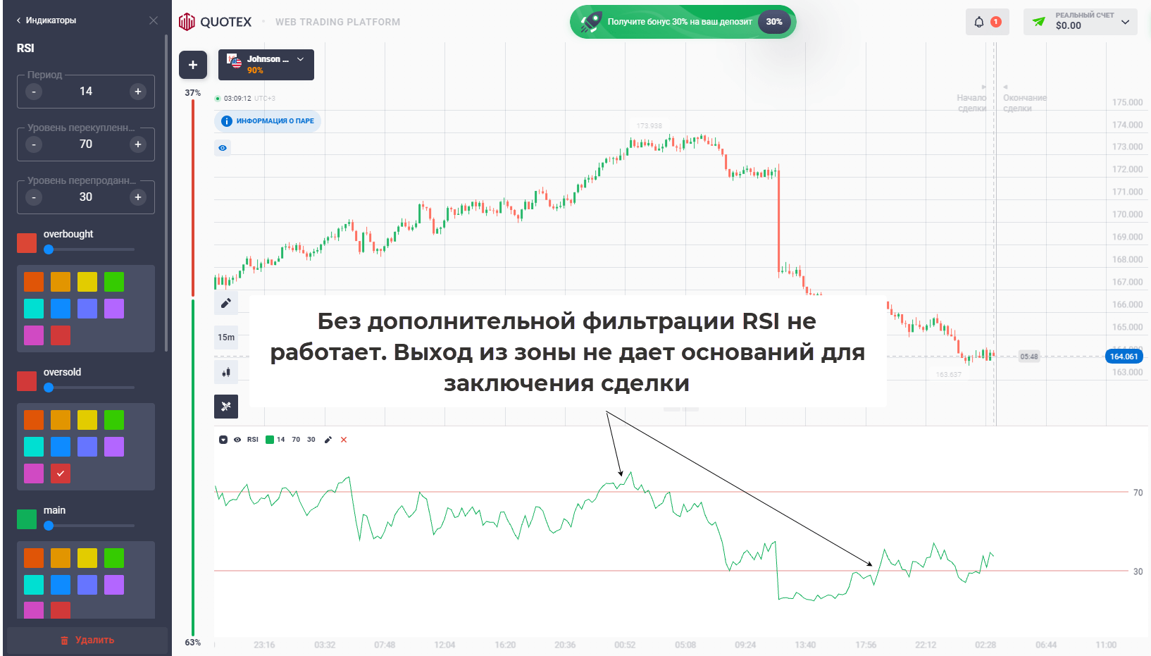RSI. Индекс относительной силы, из особенностей выделим фиксированную шкалу и зоны перекупленности/перепроданности. На нем можно искать дивергенции и конвергенции, брать в работу сигналы при выходе из зон.