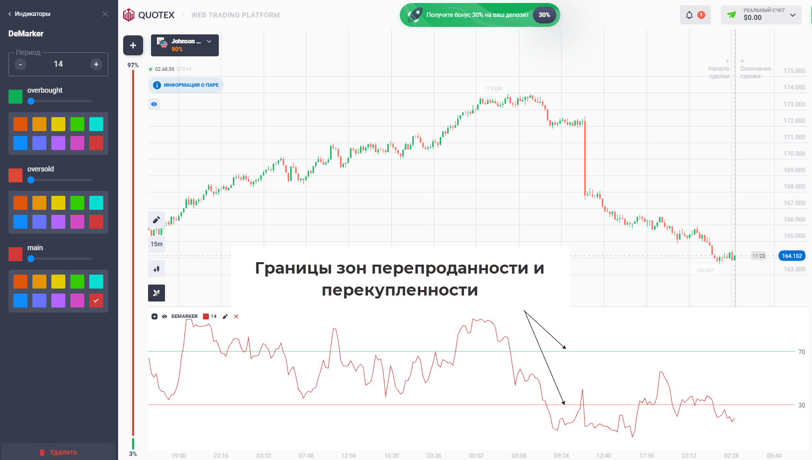 DeMarker. Используется по той же логике, что и Стохастик, RSI. Есть фиксированная шкала, при входе в область перепроданности повышается вероятность нисходящего значения и наоборот.