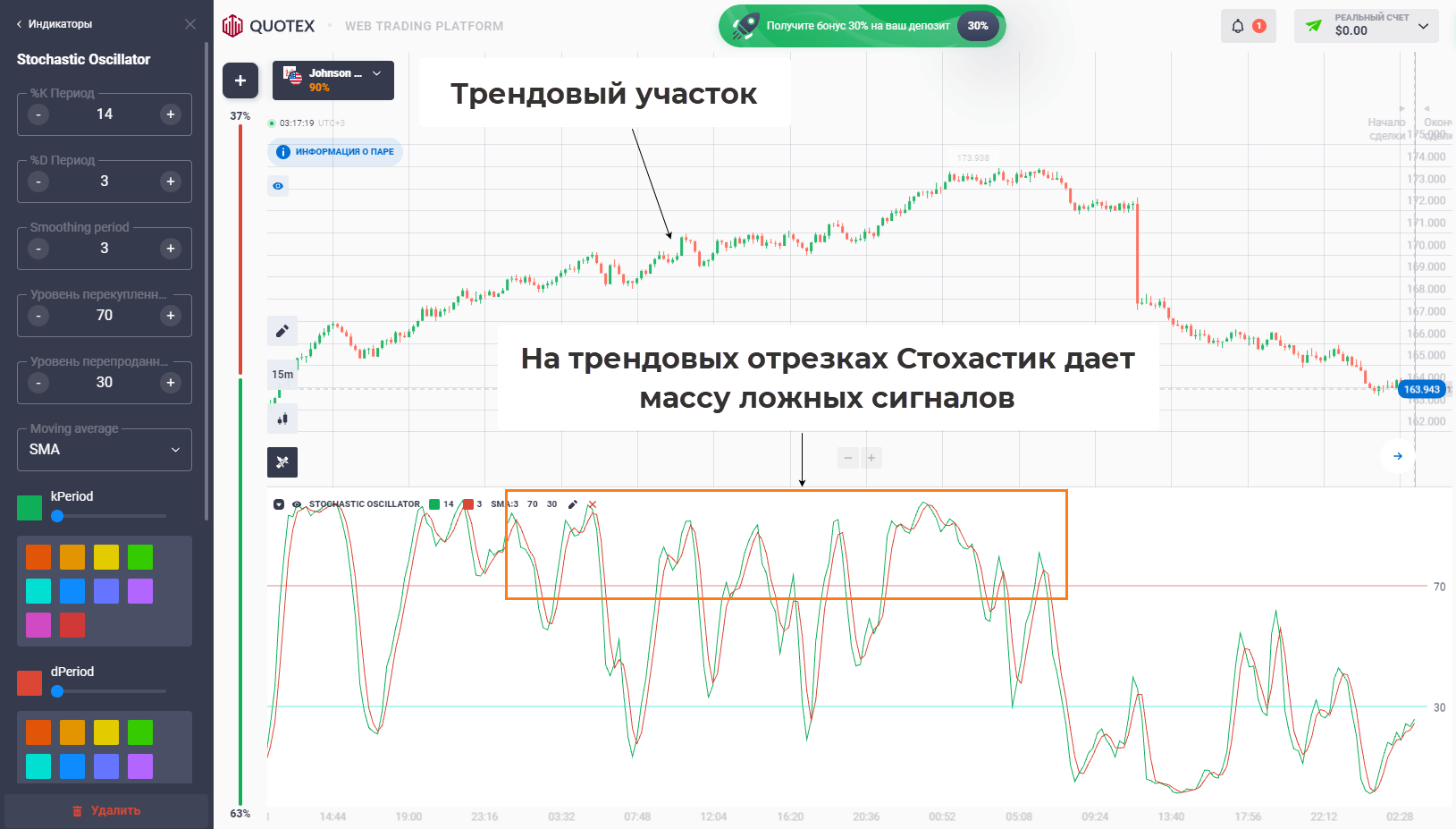 Самые популярные осцилляторы – Стохастик, RSI, ADX, но у Quotex доступно больше 10 индикаторов этой группы. К ним относятся: