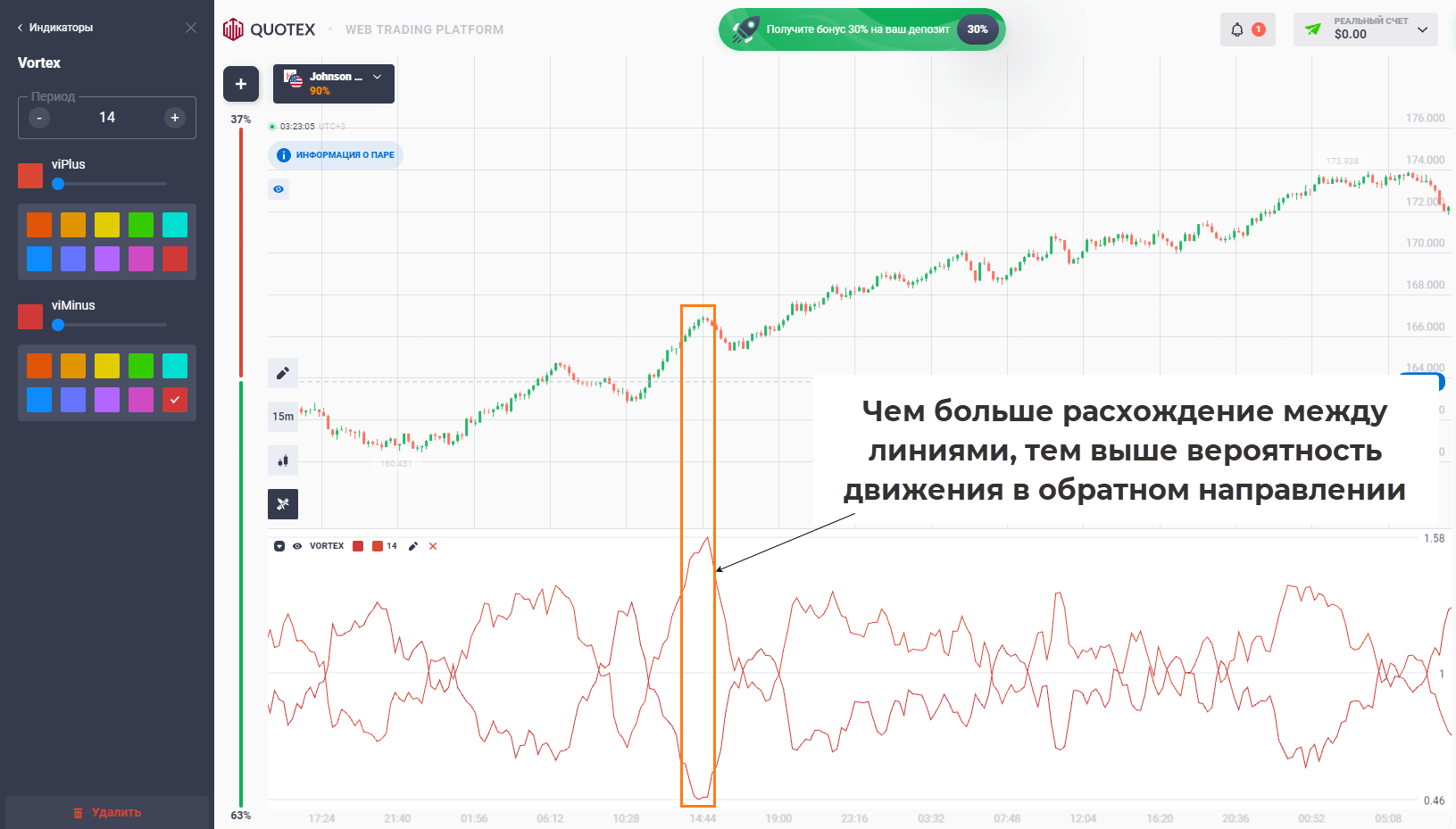Vortex. Работа ведется по пересечениям линий ±VI. Можно ориентироваться на расхождение линий, чем оно выше, тем выше вероятность обратного движения графика.
