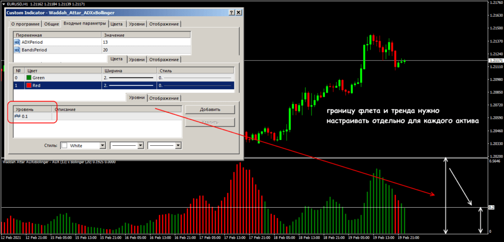 Обратите внимание на соответствующую вкладку – хотя бы один уровень нужно установить обязательно. Это так называемый уровень баланса между флетом и трендом, пробой которого означает, что рынок переходит в активную фазу и можно искать точки для входа