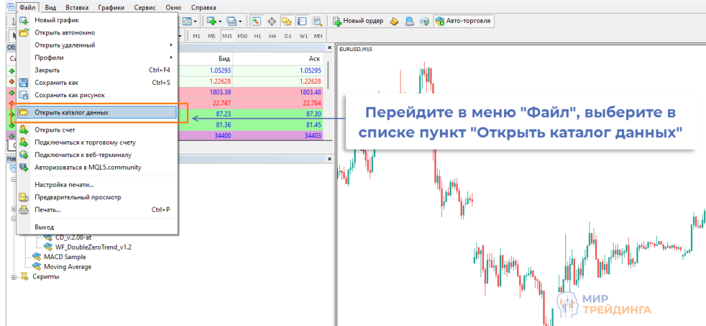 в терминале найдите меню «Файл», в нем выберите пункт, открывающий каталог данных;
