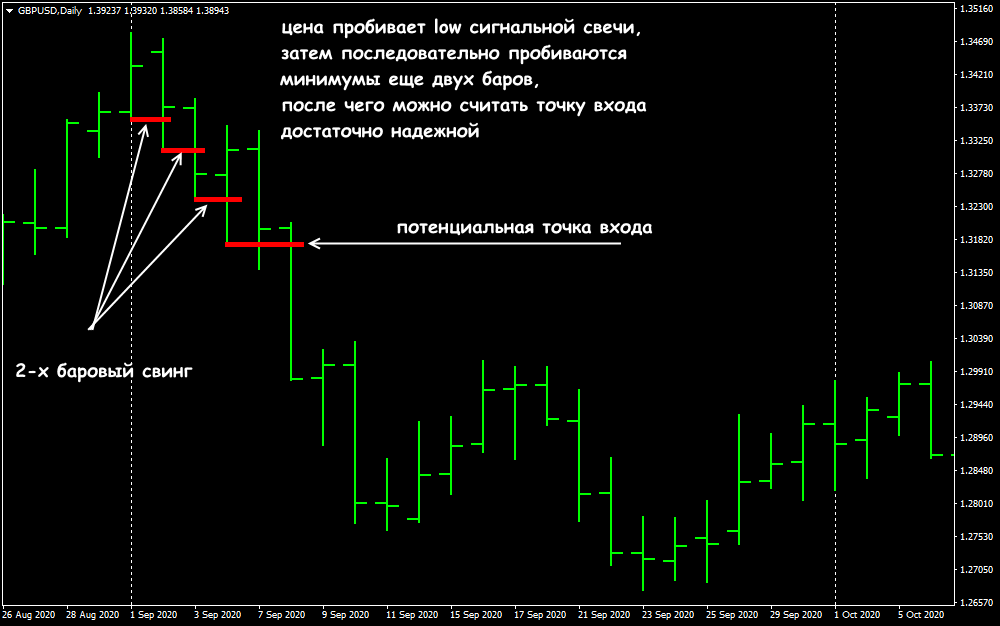 Предполагается, что за сигнальной свечой как раз и формируется свинг, то есть следующий бар должен пробить критический уровень max или min. Далее ожидается торговля исключительно на пробой, причем при условии последующего движения цены в сторону нового тренда. Ложные пробои, естественно, случаются, но стратегия свинги Ганна четкого плана действий на этот случай не имеет.