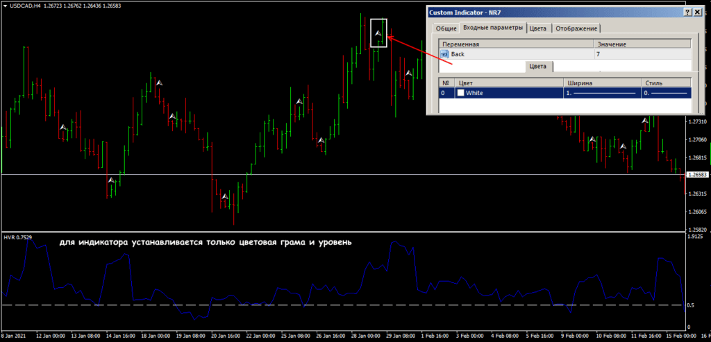 Признаком повышенной (пригодной для торговли) волатильности будет движение линии индикатора HVR выше уровня 0,5.