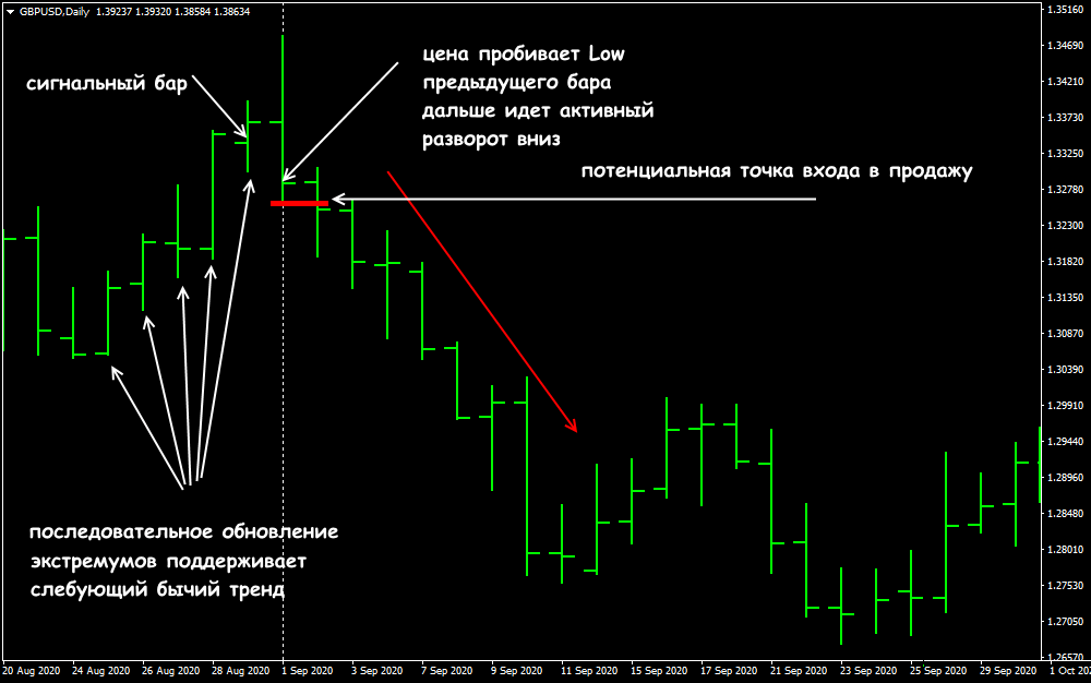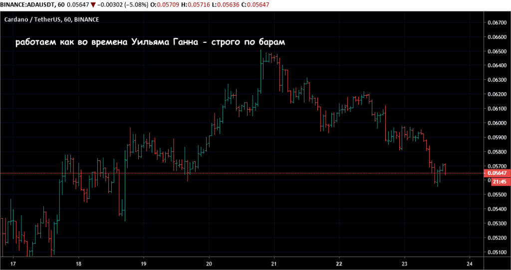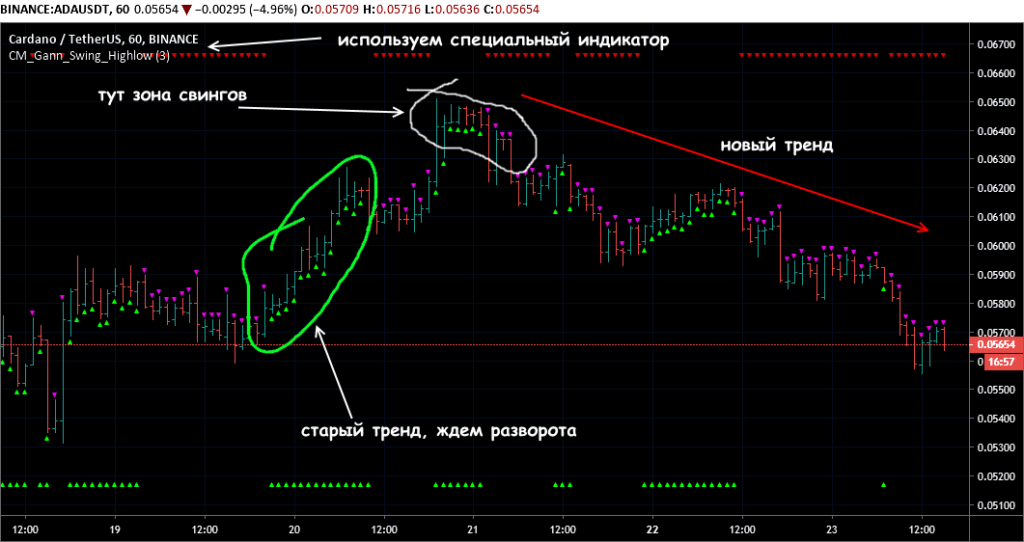 Фактически, это колебания цены в привычном нам тренде: если цены high последовательно повышаются – тенденция к росту (бычий свинг) − покупки в приоритете, если последовательно снижаются low – тренд нисходящий (медвежий свинг) – нужно продавать. Просто современные трейдеры привыкли оперировать ценами открытия/закрытия, потому что слишком «длинные» тени искажают картину и отменяют логику Ганна.