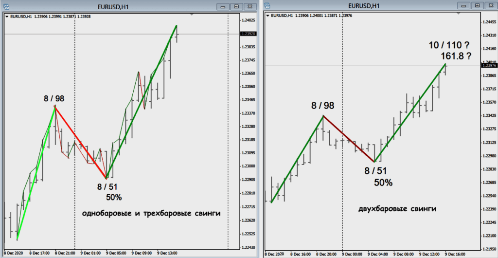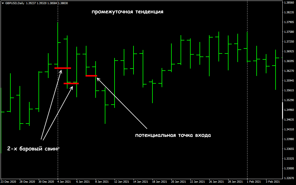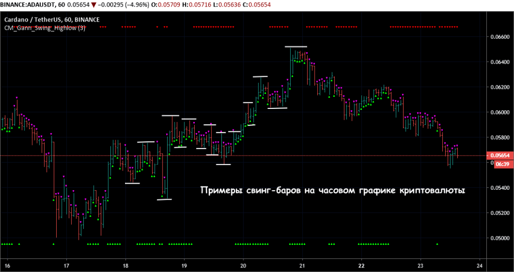 Свингами (от англ. swing – движение) в трейдинге называют модель на граничных значениях цены, где каждая последующая обновляет max/min предыдущей.