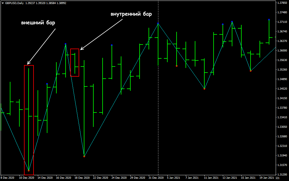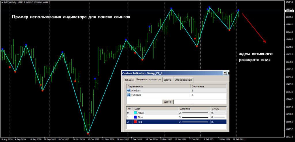 Еще один вариант индикатора свингов строит на графике цены привычный нашему глазу ZigZag но ключевые точки определяет по особой логике