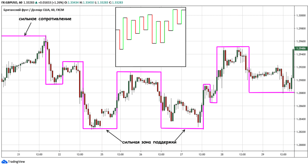 На схеме Swings бычий и медвежий бары показаны разными цветами, но они без учета единицы времени должны иметь одинаковую ширину. Такой график еще называют манхэттенским.