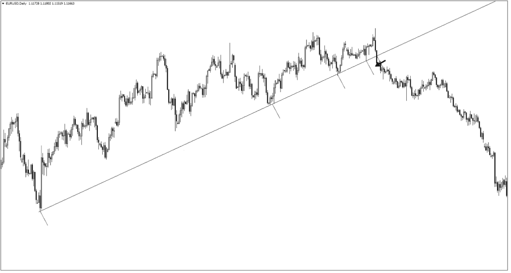 Например — если сильная линия тренда, идущая вверх, пробита, то цена будет болтаться под ней. Последующее движение цены столкнется с этой линией как с сопротивлением — хотя до того она была поддержкой. Да, так бывает.