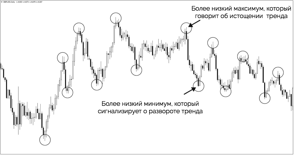 Восходящий тренд — это рынок с более высокими максимумами и более высокими минимумами. Нисходящий тренд — это рынок с более низкие минимумами и более низкими максимумами.
