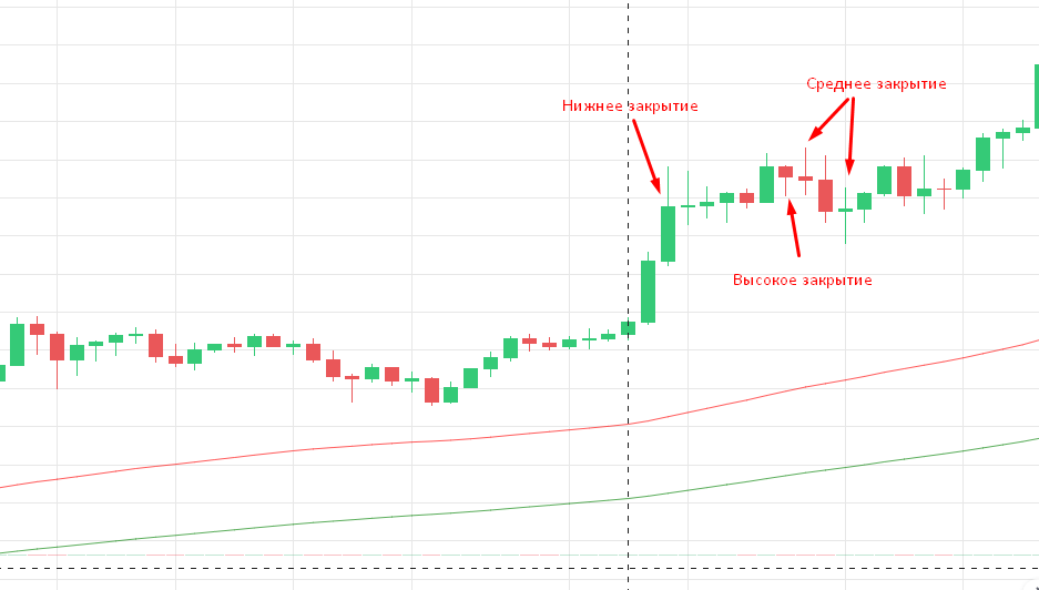 1. Положение средних линий относительно друг друга на последней закрывшейся свече.
