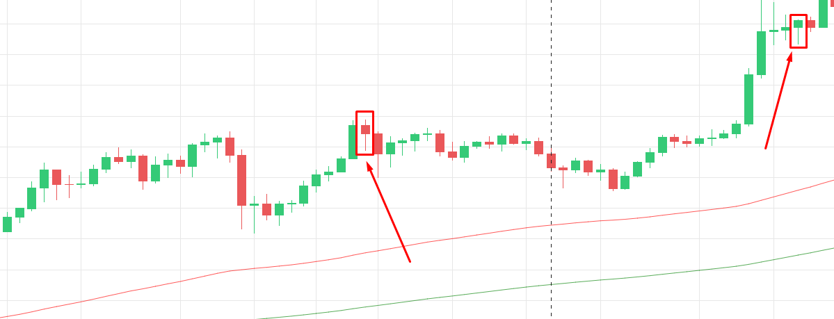 Может быть две, три или больше маленьких свечей, это не важно, главное, чтобы все они были в пределах материнской свечи. Последняя свеча этой модели должна быть такого же цвета, как и первая, в нашем примере это «бычья свеча»