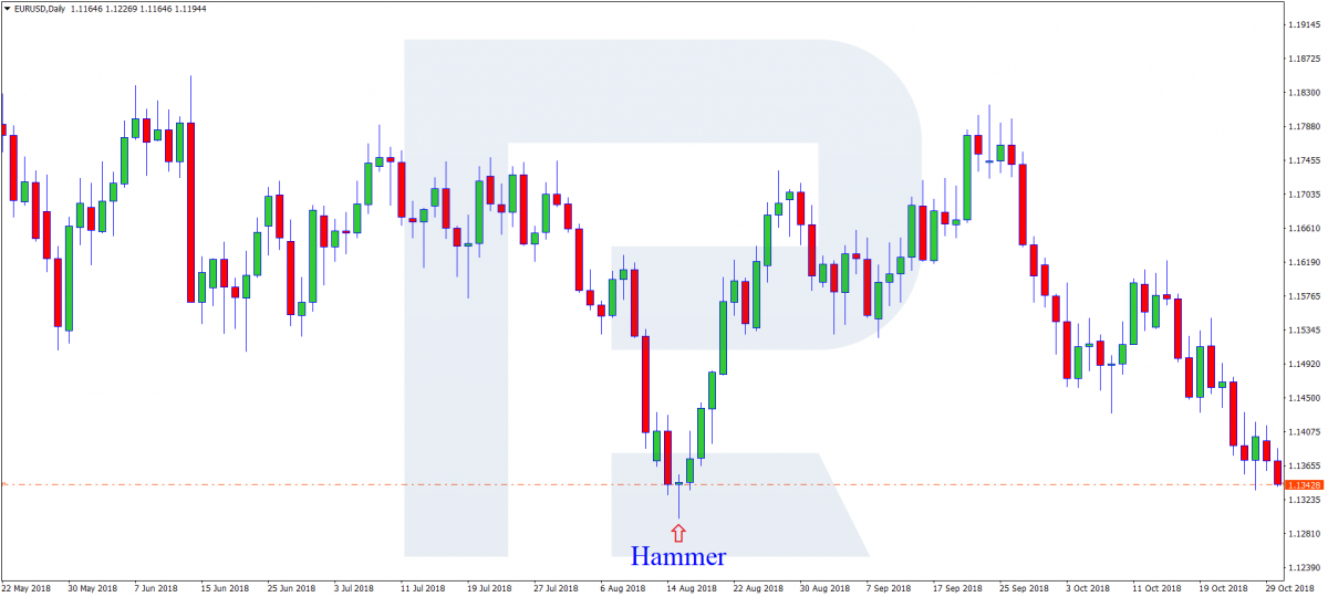 Молот — это свеча с относительно коротким телом и длинным нижним фитилем (в 1,5-2 раза длиннее тела). Верхний фитиль или отсутствии или очень короткий. Молот свидетельствует о развороте тренда. Вот примеры молота: