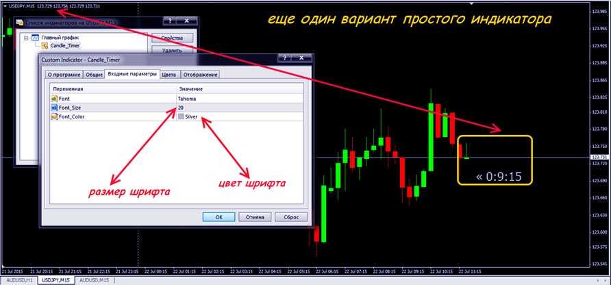 Некоторые популярные торговые системы имеют в своем арсенале еще один простой индикатор – Candle_Timerс, который снабжен точно такими же функциями, как и алгоритм EJ Candle Time, но с некоторыми настраиваемыми параметрами: