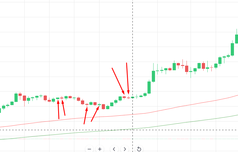 Доджи — свечи с небольшим телом и длинным фитилями. Свидетельствуют о низкой волатильности и формировании бокового тренда на рынке. Вот пример свечи доджи: