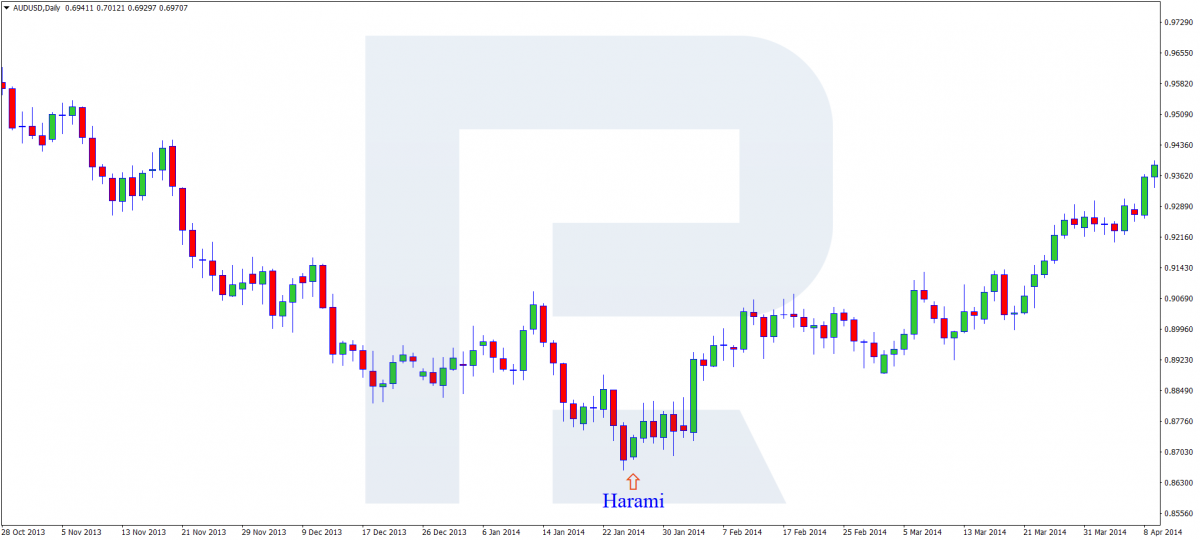 С японского языка «харами» переводится как «беременная». Первая свеча — «мать», вторая — «ребенок». Рассмотрим модель на бычьем и на медвежьем тренде.